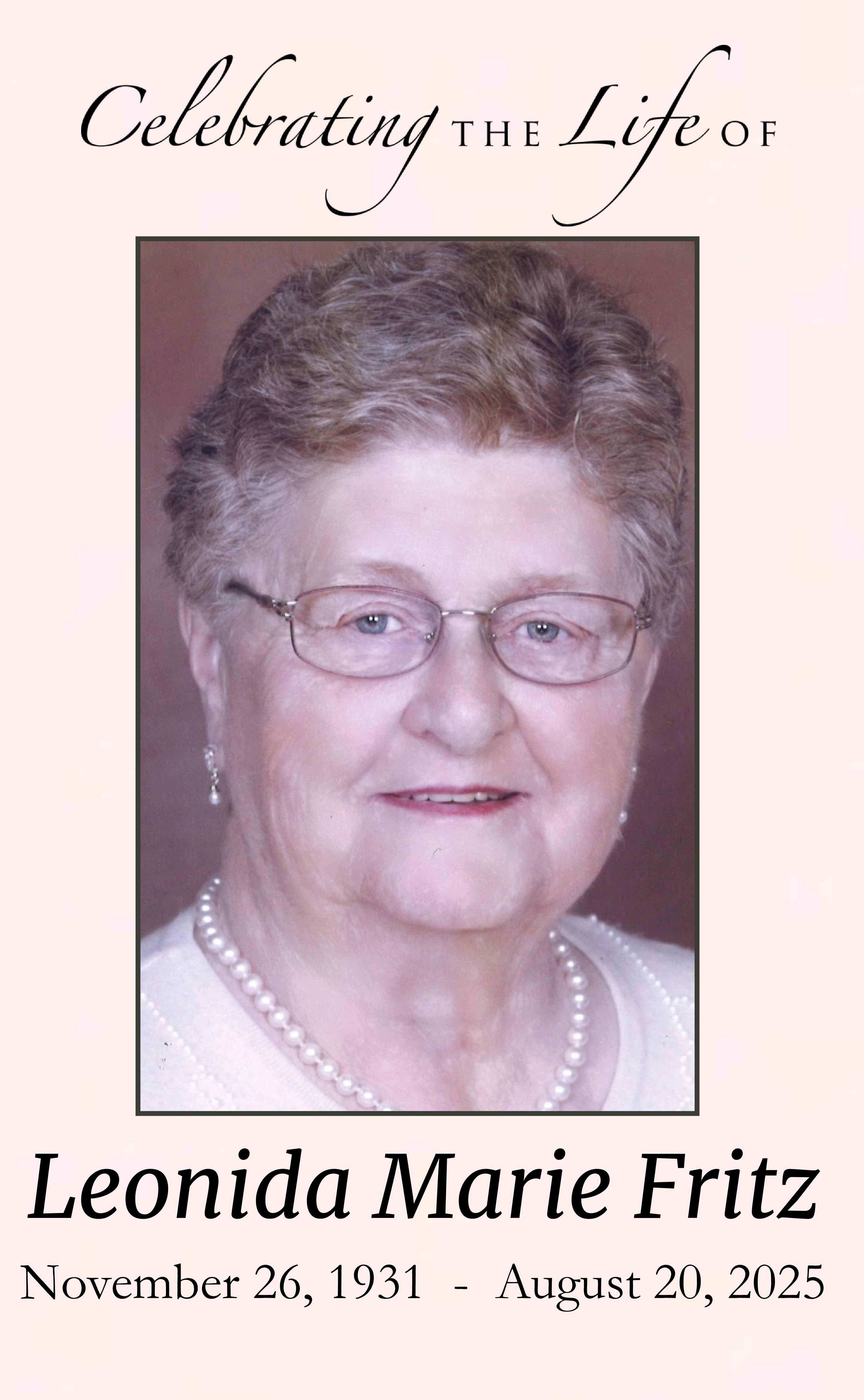Leonida “Lee” “Toots” Marie (Berns) Fritz, age 93 of Perham, MN died Wednesday, August 20, 2025 in Perham Living. Visitation will be 10:00 a.m. to 12:00 p.m. followed by the Funeral Mass at 12:00 noon on Tuesday, August 26 at St. Henry’s Catholic Church in Perham with Fr. Omar, Fr. Nathaniel, and Dcn. Richard Quistorff officiating. Burial will be in the church cemetery.