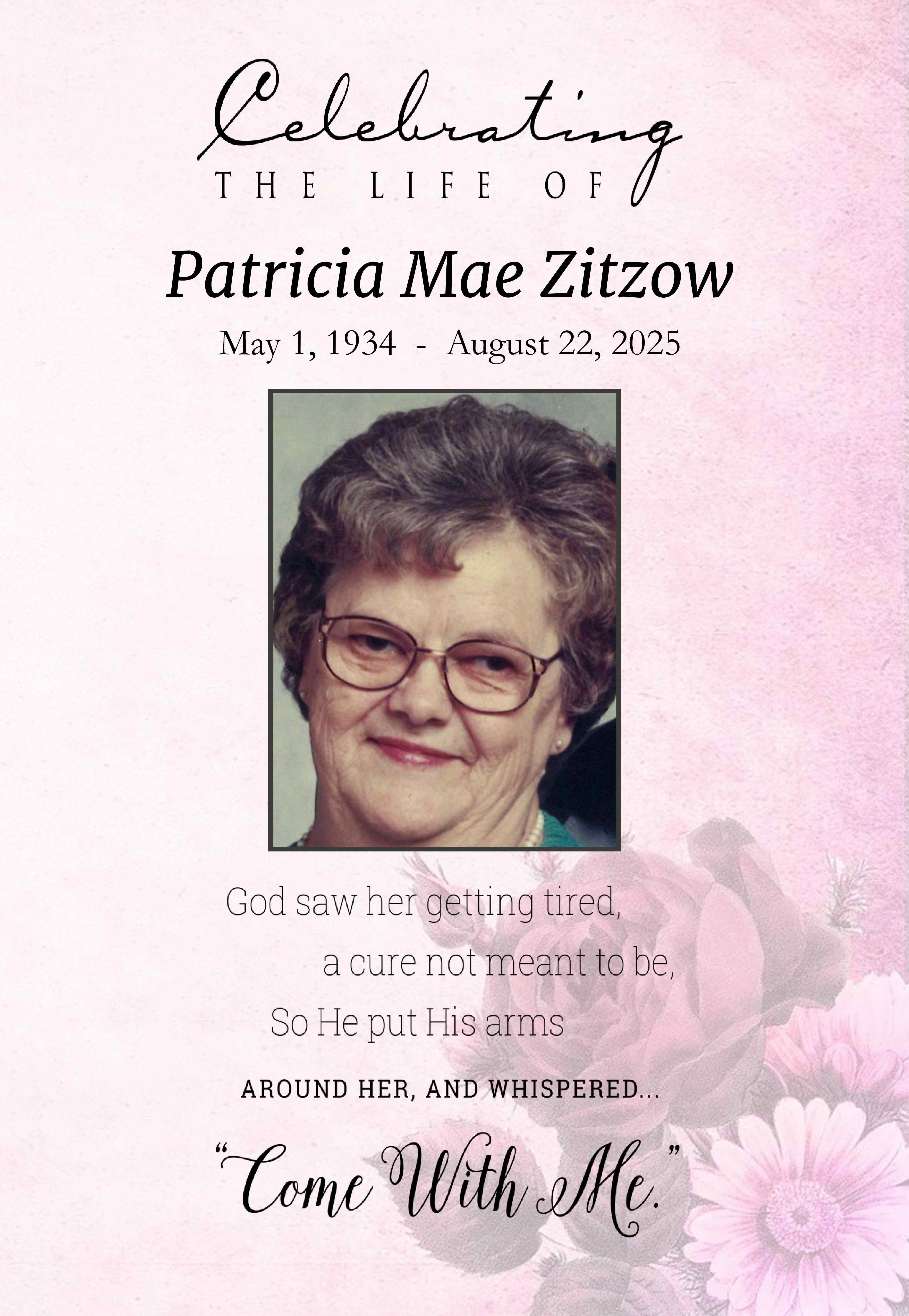 Patricia Mae Zitzow, age 91 of Dent, MN passed away peacefully surrounded by her husband, family, and loved ones on Friday, August 22, 2025 in Perham Living. Visitation will be 10:00-11:00 a.m. followed by the Memorial Service at 11:00 on Saturday, September 6 at Schoeneberger Funeral & Cremation Service in Perham, MN. A Committal Service will follow at 1:00 p.m. at Calvary Memorial Cemetery near Perham.